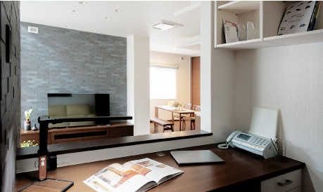 スキップフロアに設けたスタディコーナーは、リビングダイニングとつながりつつ獨立性のある空間