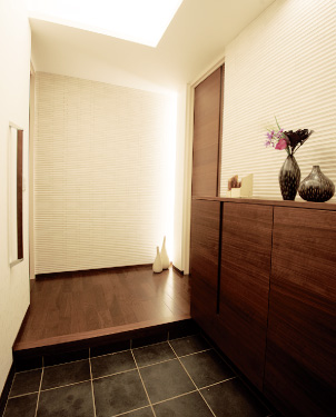 玄関ホールには質感と調濕機能のあるエコカラットを張り、間接照明で陰影を際立たせています