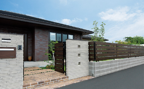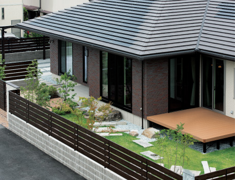 建物とのバランスを吟味してデザインした外構。木調のフェンスやレンガで作ったアプローチが優しい表情をたたえています