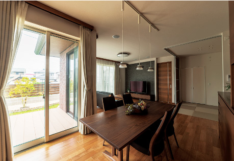 ウッドデッキとダイニング、リビング、タタミコーナーが一続きに。大勢で集まってもゆとりのある空間です
