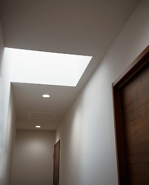 トップライトから自然の光が注いで、廊下も明るさ十分