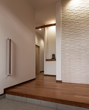 ニッチに舊邸の木材を用いた玄関ホール。エコカラットと間接照明で印象的に
