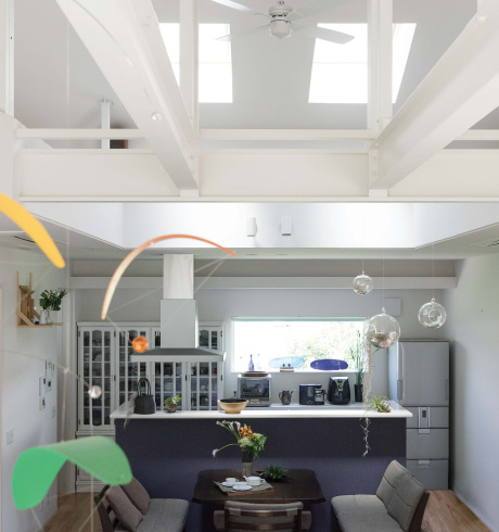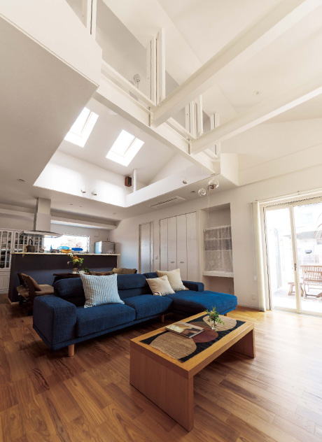 続き間になったキッチン、ダイニング、リビングは、掃き出し窓やトップライトから光を取り込み、開放感いっぱい。ソファやラグ、タペストリーなどを藍色でそろえ、大人のリゾートを思わせる室內イメージに仕上げました。