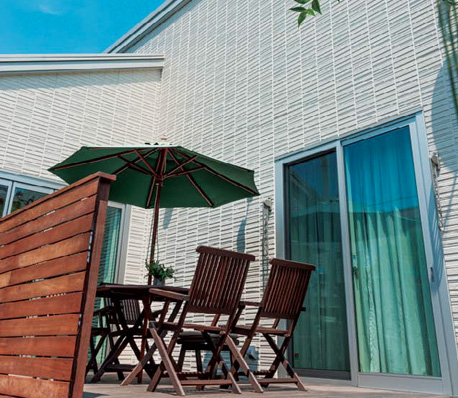 リビングと主寢室の間に設けたウッドデッキのテラス