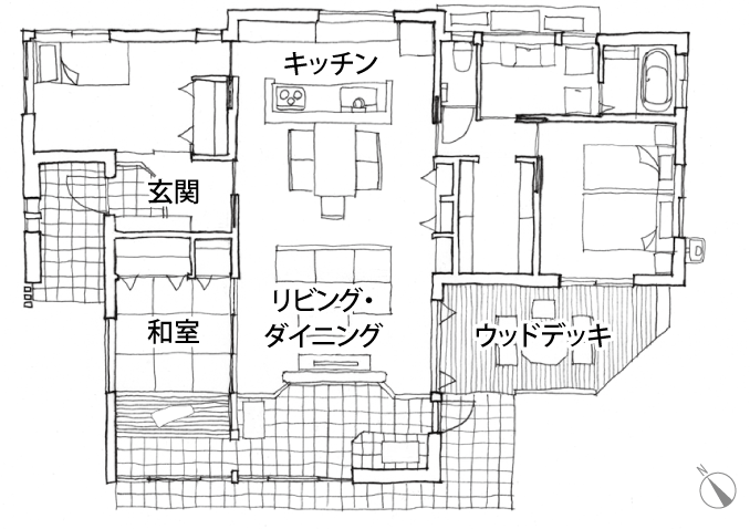 またリビングからは、直接テラスに出入りすることもできます。パラソルやガーデンチェアを置いたウッドデッキで、青空の下ティータイムを楽しむことも。カーポートからの動線が良いため、普段はこちらから出入りすることが多いそうです。
