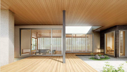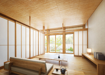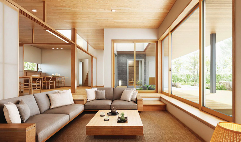 深い軒の下に設けた縁側に、床を下げ窓辺に寄り添える「ロースタイル」を組み合わせることで、內と外がより近づいた印象に。部屋の中に居ながら、四季の風情を味わうことができます。構造體の強さを生かし、最大7m10㎝※の大開口の設計も可能です。
