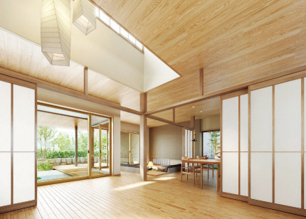 獨自の技術による大空間?大開口は、人と自然との距離を一層近づけます。また、天井高2m72㎝※の大空間は、可変性を高めることでくつろぎの場にも、客間にもなり得ます。