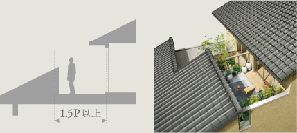 勾配屋根をより美しく大きく見せるため、獨自の「ルーフインバルコニー」を採用しました。外側から腰壁手摺りが見えにくく、芯々1.5P以上の奧行きを確保できます。