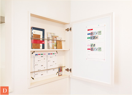 冷蔵庫にペタペタ貼ってしまいがちなお知らせプリントやDM、チラシなどをまとめます。來客時(shí)はさっと扉を閉じて隠せます。