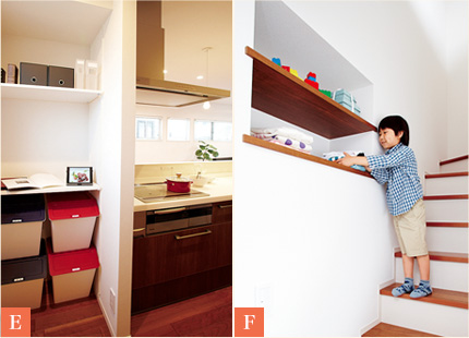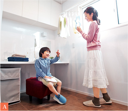 一人ひとりが自分の持ちものをきちんと管理できるスペースや、適所に設(shè)けた収納などによって、家事は驚くほどスムーズになります。また、帰宅後の動(dòng)線にも一工夫。玄関から収納スペースやユーティリティを通ってリビングに向かうことで、著替えや小物の片づけがしやすくなります。