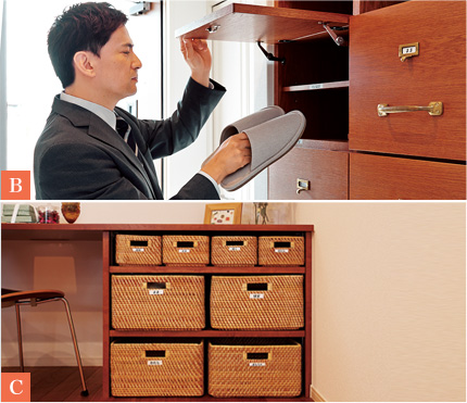 リビングやダイニングには個(gè)人の荷物が散らかりがち。一人ひとりのボックスに片づければ、大事なものの紛失も防げます。