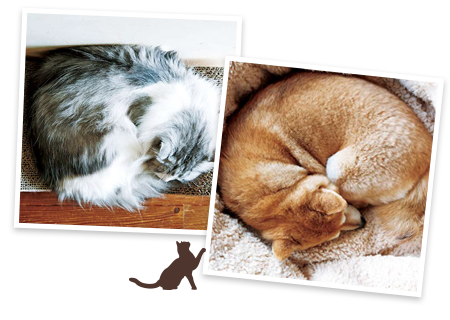 お腹がいっぱいになったら、くるっと丸くなっておやすみなさい。コウハイは爪とぎボード、センパイはひだまりのベッドがお?dú)荬巳毪辍?/p>