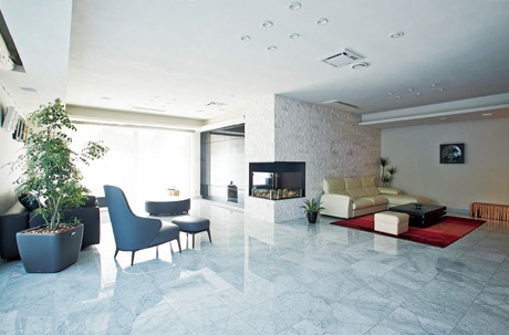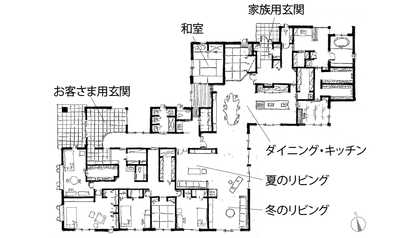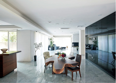 特徴的なのは、大理石の床で結ばれた二つのリビング。冷え込む冬の時期には南側のリビングで、日差しが強い夏には直射日光の當たらない北側のリビングで快適に過ごすことができます。