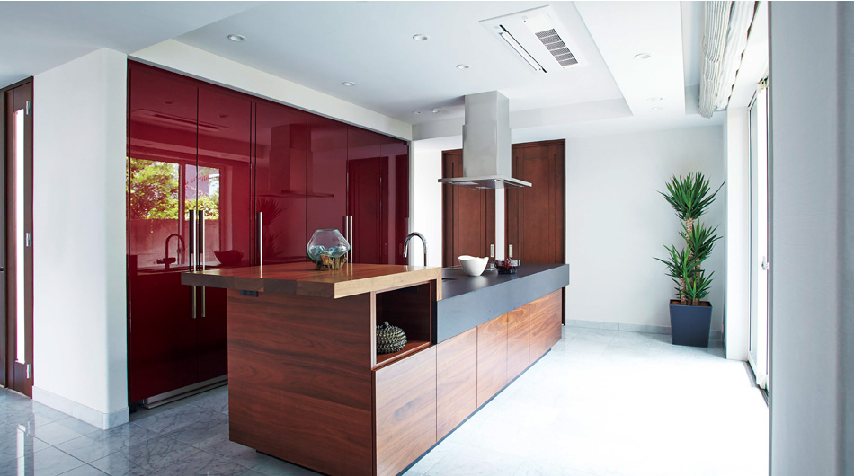 「キッチンには収納が充実しているので、スッキリとした空間を保てます」と妻の理恵さん。赤い鏡面の収納扉と、木の素材感を生かしたシステムキッチンのコントラストが印象的です。