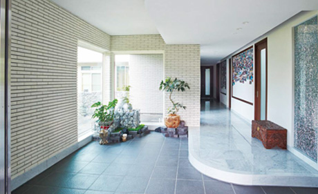 客用の玄関ホールには外壁と同じタイルを用いており、さらにFIX窓からも外壁のタイルが見える仕掛け。訪れるゲストへの、美景のおもてなしです。