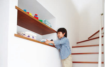 畳んだ洗濯物や子どもの本など、後で各自が2階に持って上がるものの一時(shí)置き場(chǎng)。階段の踏面を荷物でふさいでしまうことがありません。