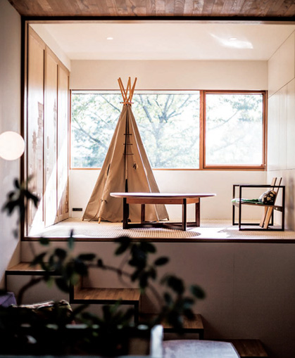 リビングから數十センチ上がったところに客間を設置。入口に建具をはめれば、獨立した和室としてもゲストの宿泊部屋としても活用できる
