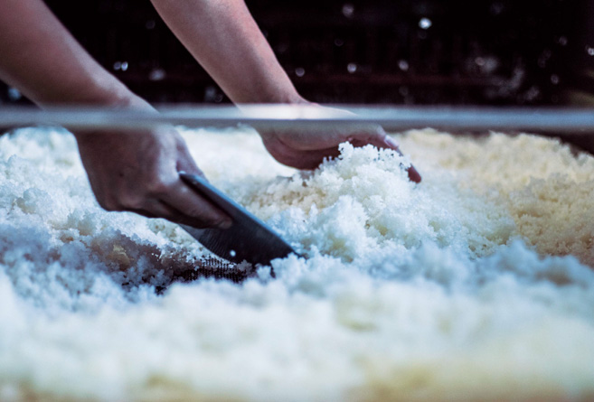 ここで、日本酒の製造工程を簡(jiǎn)単にご紹介しましょう。日本酒は米を発酵させて作る醸造酒。まず原料の酒米(日本酒の原料に適した品種の米)を磨いて余分な脂質(zhì)やたんぱく質(zhì)を除き、洗米し、釡で蒸したのち麹菌をかけて麹米を作ります。
