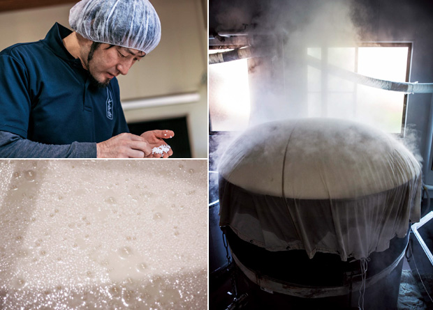 右:蒸米の工程。巨大なタンクから湯気が立ち上る