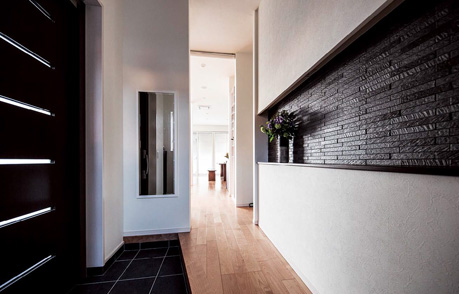 玄関のニッチはアクセントのエコカラットで引き締めて。斜めに設(shè)けた式臺により、広さとゆとりを感じさせます