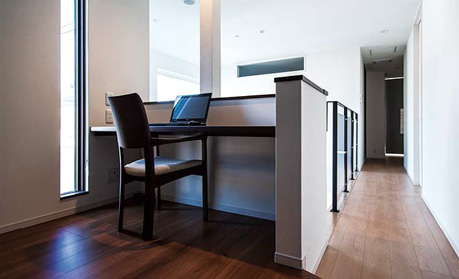 2階ホールに設(shè)けた貴弘さんの書斎。床を一段上げて、スキップフロアが見えるように設(shè)計