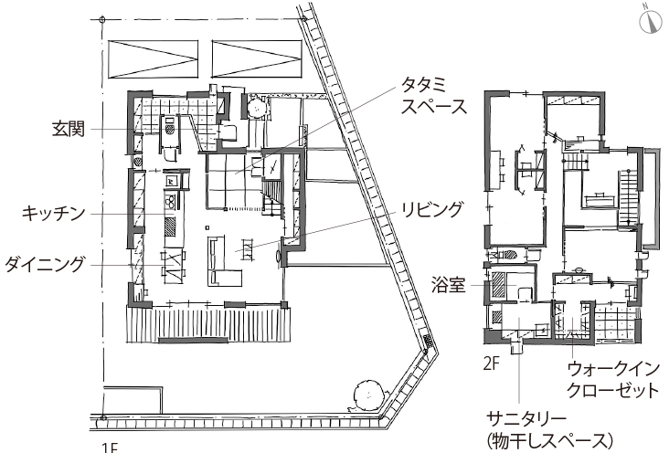 また、2階は浴室、サニタリー(物干しスペース)、ウォークインクローゼットが連続しており、洗濯家事がとてもスムーズ。さらに、大型のリビング収納や、タタミスペースの段差を利用した引き出し収納、キッチン背面収納などにより、すっきりした空間が保たれています。