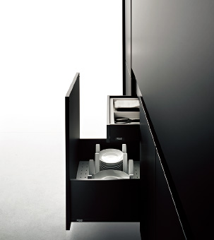 美しさだけでなく、ユニークな開閉方式をデザインしたギャラリーキャビネット。扉が上下にスライドすると、背面から光を浴びた食器が登場する