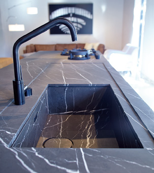 グレーの大理石を天板やシンクに使用したキッチン。細部にまでデザインのこだわりが光る