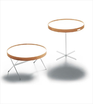 「ちゃぶ臺」に発想を得たサイドテーブルは、nendoのデザイン。トップを取り外して付け替え、高さを変えることができる