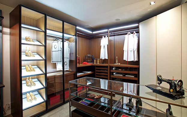 ブティックのような空間を作り出すポロの収納。シューズやドレスを照明が美しく照らし出す