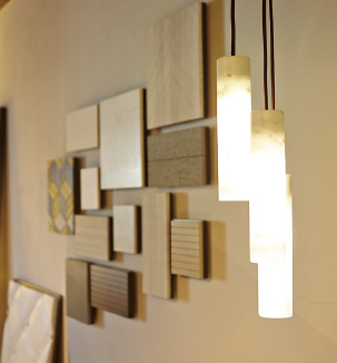 壁材の他、透明感のある素材を使った石のランプシェードも手がけている