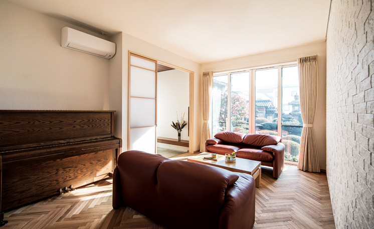 Kさま邸を訪れるゲストは、ゆったりと広いお客さま用の玄関ホールから中へといざなわれます。玄関ホールから続く応接間は、質(zhì)感の豊かなエコカラットの壁や、赤いソファがアクセントになっています。「住宅展示場で見た床のデザインに一目ぼれして」と妻のYさんが選んだ床材は、木目のきれいなヘリンボーン張り。応接間の格調(diào)を高めています。