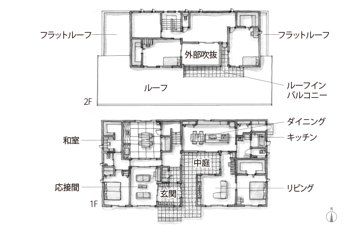 ご夫妻がこだわられたのは、毎日の暮らしの場を明るく快適にすることと、お客さまに心地良く過ごしていただくことでした。そこで、來客をもてなすスペースと、家族が快適に過ごすスペースを分けてプランニング。中庭を設(shè)けることで、北側(cè)のキッチンやダイニングにも光と風(fēng)を取り込みます。