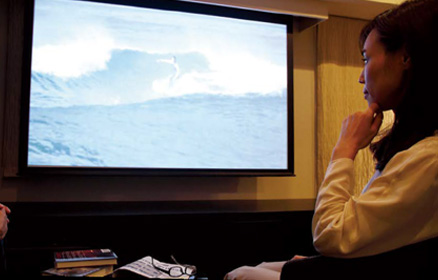 映畫を見る時は「OK Google, シアターモードにして」と一聲。プロジェクターが自動で下り、シアターモードの照明に。