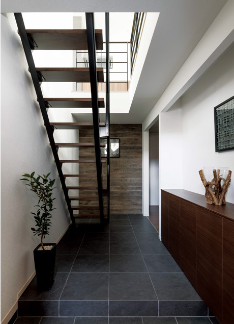 玄関にも吹き抜けを通じて光を?qū)盲堡毪郡?、ハイサイドウインドウやスケルトン階段を採用。階段を上がると目の前に広がる2階の景色がさらに広く感じられるよう、板張りの天井の傾斜などにも工夫が凝らされています。