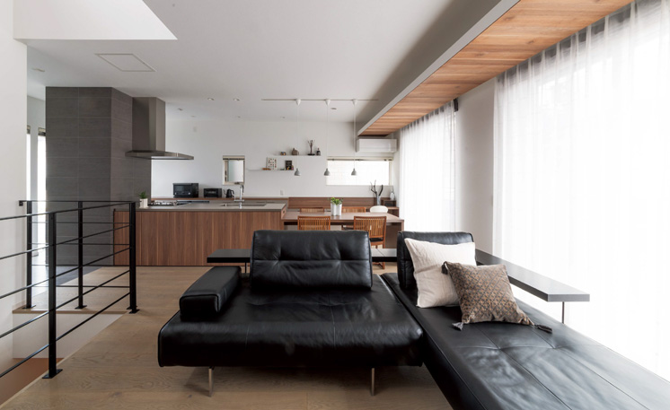 インテリアのベースは天然木の床材。裸足で歩いて気持ちの良いグレイッシュな床をキャンバスに、存在感のある黒革のソファや、階段のアイアン手摺が引き締めます。