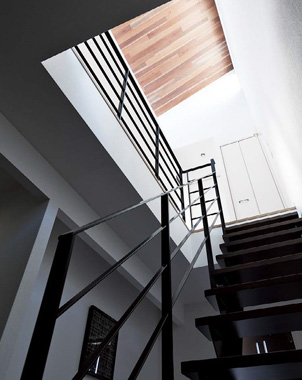 吹き抜けの階段ホール。白い壁に光を反射させ、1階にも明るさを確保します