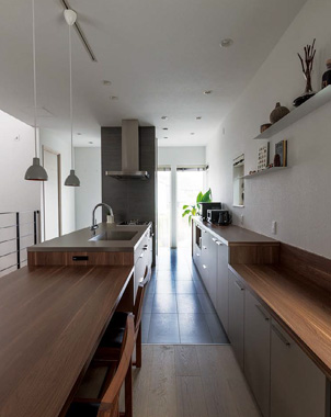 キッチンに立って北側(cè)に目をやると、こちらも道路に向かって視界が開けており、気持ち良く家事ができます。冷蔵庫置き場を兼ねた柱で適度に外からの視線を遮りつつ、北からの安定した光を取り込みます。