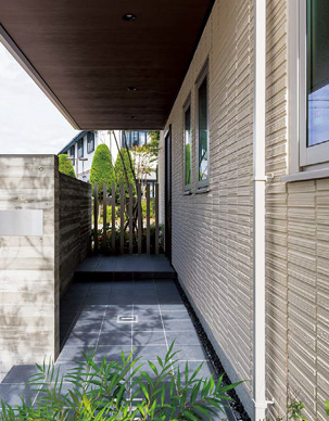 杉板の模様が美しいコンクリートの門扉。玄関ドアを入るまでの動線をあえて長くして期待感を高めます