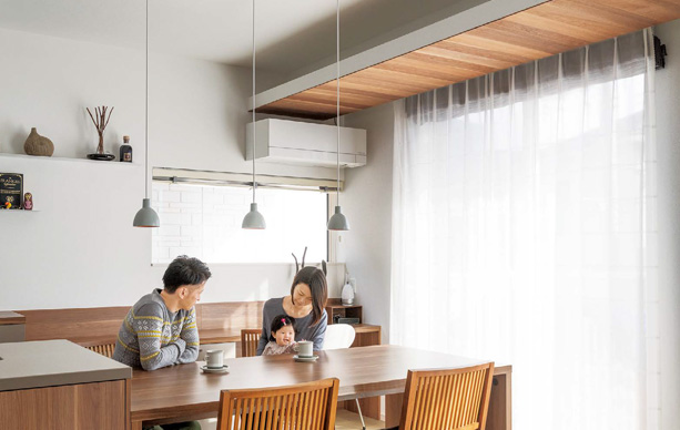 ダイニングでくつろぐNさまご家族。冬場でも室內(nèi)は暖かく、裸足で過ごすことが多いそう