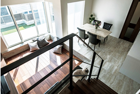 Fさま邸を象徴する中2階のファミリースペース。1?2階をつなげて住まい全體を一體化させる空間です。高い位置に設けた窓からは、さまざまな表情の空を眺めることができます