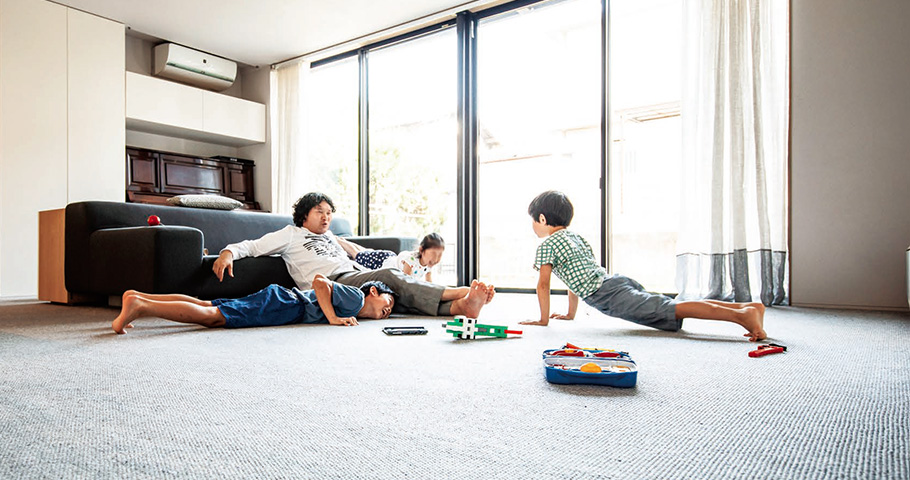 「床座で暮らしてきた日本人の感覚に、カーペットの生活はぴったり合っていますね。低い目線で暮らすから天井がより高く、部屋が広く感じられるんです」と堀田さん。わんぱく達が走り回って転んでも大きなケガをしにくいため、安心して見守っていられます。危険の多い階段も、子ども達は早い時期から一人で上り下りできるようになりました。