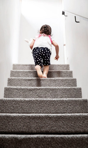 カーペット敷きの階段を難なく上る、末っ子の茜ちゃん