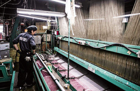 ウィルトン織機1臺に織工が1人、付きっ切りで作業。目と耳を駆使して機械のクセやその日の狀態を見抜き、均一な生地を織り上げていきます