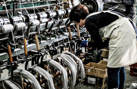 堀田さんが住宅の床に一番適していると考えるのは「密度の高い、ウールの織物カーペット」。堀田カーペットではウールの中でも特にイギリス産の原料にこだわっています。羊毛選びから紡績、染色までは昔から繊維産業が盛んな地元?泉州地域の協力會社とタッグを組みながら。糸を繰り、機械で織り上げ、補修や加工、仕上げを行うのは自社で。より良い品質と、新しいデザインの可能性を日々追い求めて試行錯誤が続きます。