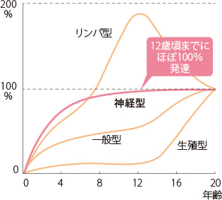 人の運動能力は、6~12歳頃の運動量?運動習慣によって決まるとされ、この時期をゴールデンエイジと言います。アメリカの醫學者?スキャモンが発表した「発育?発達曲線」によると、運動能力に関係する「神経型」は、12歳頃までにほぼ100%発達するとされています。つまり、この期間にさまざまな運動を経験して神経を刺激することで、運動能力を高められるのです。