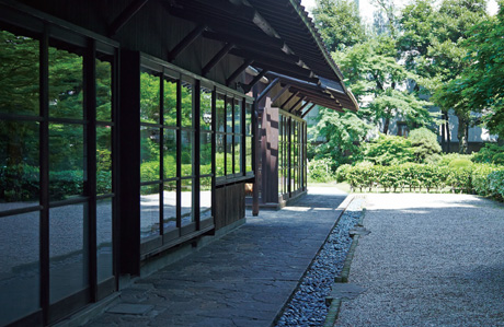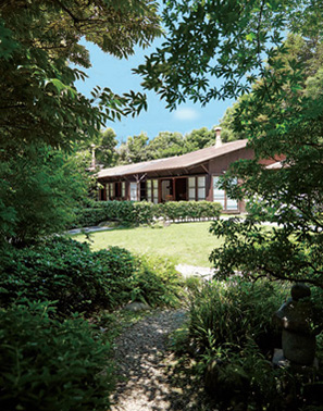 南東側から見た井上房一郎邸。勾配の緩やかな切妻屋根が緑に調和し、優雅な雰囲気を生み出している