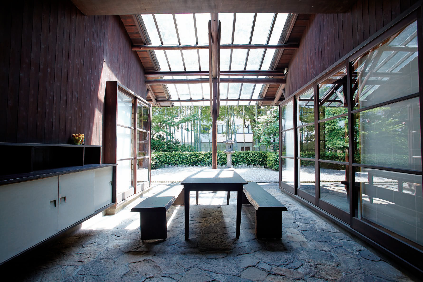 パブリックとプライベートを分ける役目を果たすパティオは、半戸外の心地良い空間です。ここで家族が休憩したり、ちょっとした來客をもてなしたりしたのかもしれません。レーモンド邸ではパーゴラ(つる棚)が設けられていましたが、井上邸ではより光を取り入れやすい透明の素材が用いられています(下畫像)。