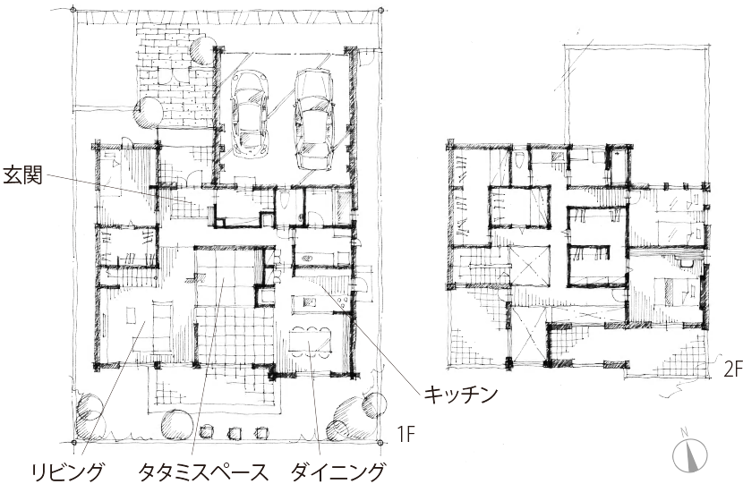 1?2階を吹き抜けでつなぎ、リビングやタタミスペース、テラスなど