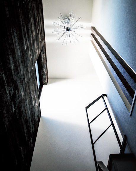限られた敷地を有効に生かして「より広がりのある明るいリビングを作りたかったんです」と語るのは夫の翔伍さん。そこで1階に主寢室をはじめとする個室を、2階にパブリックスペースをレイアウトすることに。シャボン玉を思わせるシャンデリアやニッチ、アクセント壁などで階段吹き抜けをモダンに演出し、上下移動時にも心弾むお住まいを?qū)g現(xiàn)されました。